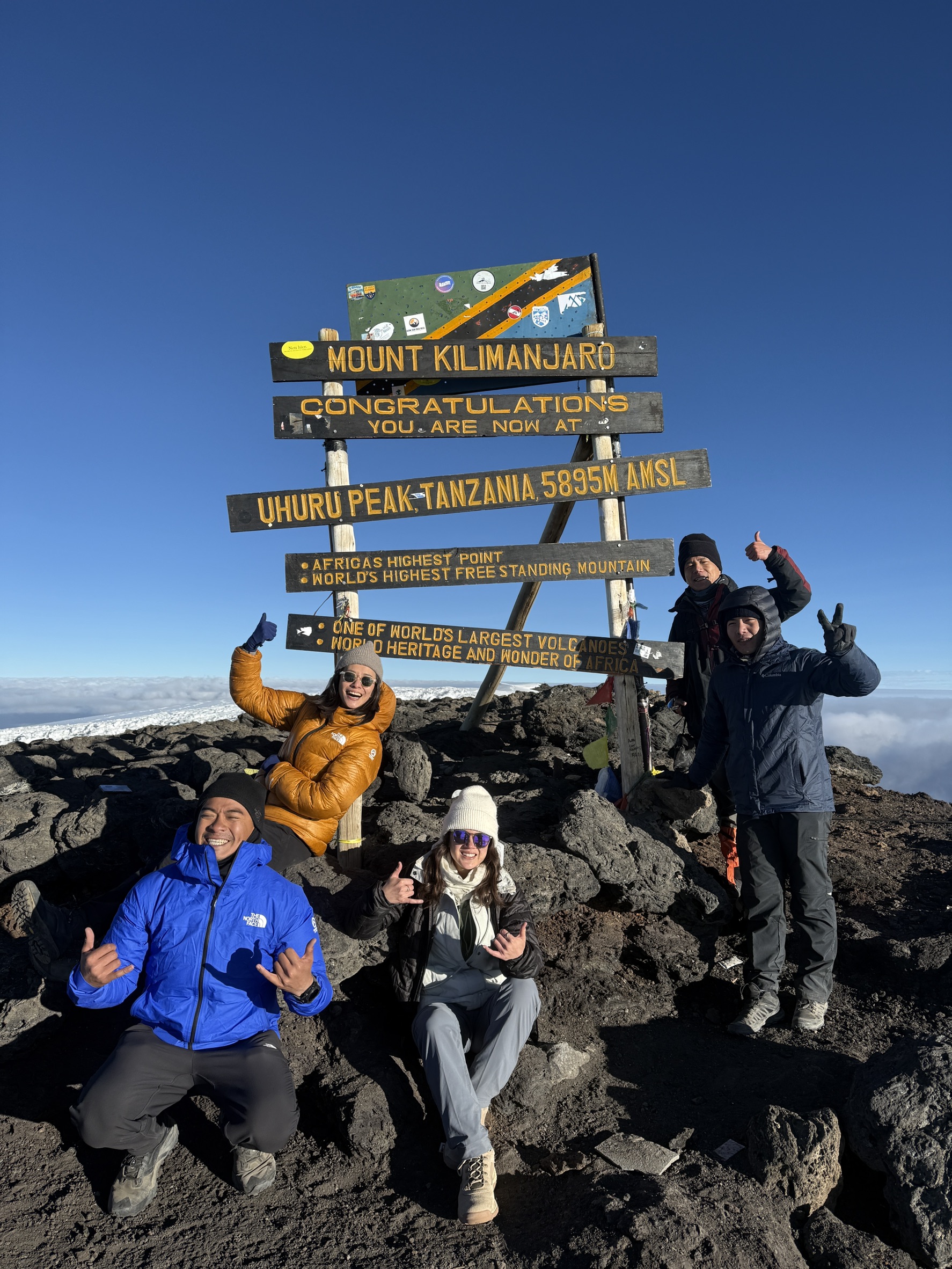登頂後,攀登者可俯瞰壯麗的雪景和冰川,日出時陽光映照在冰面上,景色無比壯觀。這些冰川在赤道附近極為罕見,儘管隨著氣候變遷逐漸縮小,但其美景依然吸引無數人前來挑戰。峰頂有一塊標牌,寫著「恭喜您登頂非洲之巔」,成為每位登山者的驕傲時刻。