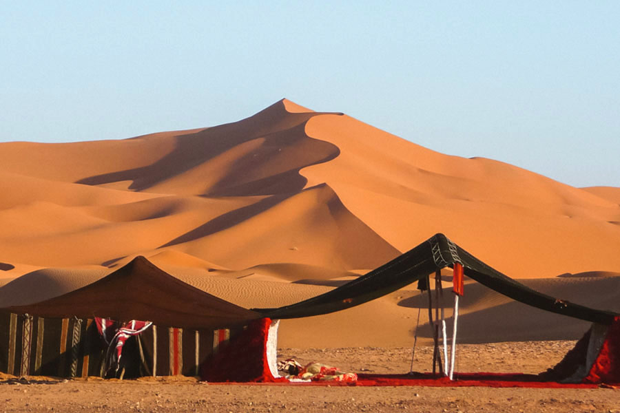 下午抵達撒哈拉沙漠邊緣的梅祖卡,換乘四驅車深入金色沙丘,騎乘駱駝欣賞夕陽餘暉,感受撒哈拉浩瀚沙海的壯闊與寧靜。夜宿沙漠帳篷,仰望滿天星斗,享受一晚獨特的柏柏爾族風情與沙漠浪漫。Breakfast: 〇